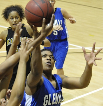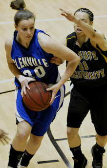 ![]() LaToya Hambrick controls the offensive boards in the second half. Story and Photos by Drew Moody The Lady Pioneers were knocked out of their #1 conference ranking in an upset Wednesday evening at West Virginia State. State led for most of the game, shooting 46-percent from the floor. Glenville, by contrast, failed to hit 70-percent of their 2-point attempts, many of them from inside 10-feet. From 3-point range they managed to connect just over 20-percent of the time. State's overall height advantage and spread out offensive attack put the Lady Pioneers game off-balance. Glenville struggled to keep in the game but never really found their composure. Although the Lady Pioneers closed out the half down 2-points, 44-42, West Virginia State dominated the first half. State spread out its offense opening up the inside, then dominated rebounding at both ends of the court. Unlike the first half scoring blitz against West Liberty last Saturday, as the clock neared the 15-minute mark the NCAA Division II highest scoring team only showed 5 points on the scoreboard.