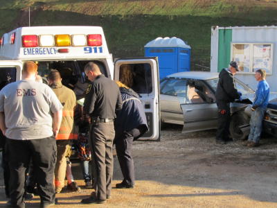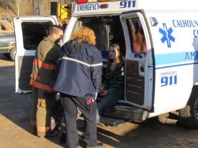 Emergency personnel tend to one of two female occupants of car A car traveling west on US 33-119 toward Spencer, Tuesday afternoon, spun out of control coming through the Corder Bridge at the Calhoun-Roane line and crashed into a parked vehicle, that impacted three other vehicles. The vehicles were parked in the Roger's Used Car lot.