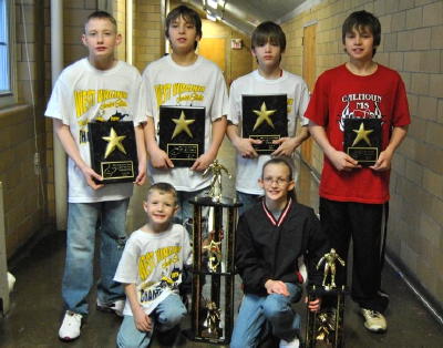 Front (L-R) Caden Jones and Katie Jones; Back (L-R) Allen Submitted by Cristina McCune Calhoun Youth Wrestlers traveled to Parkersburg WV on March 5th and 6th for the WV Junior State Wrestling Championships at Parkersburg High School. First place winners were, Caden Jones 4 and under 42lbs, Allen Metheney 11-12 95lbs, Cole Ritchie 11-12 115lbs, Houstin McCune 13-15 86lbs. Third place winner was, Casey Ritchie 11-12 105lbs. Fourth place winners were, Brandon Yoak 9-10 54lbs and Katie Jones 9-10 58lbs. Sixth place winner was Ryan Stilgenbauer 7-8 75lbs.