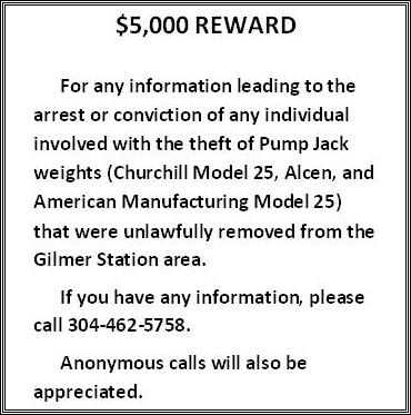 $5000 REWARD OFFERED - Pump Jack Weights Removed From Gilmer Station