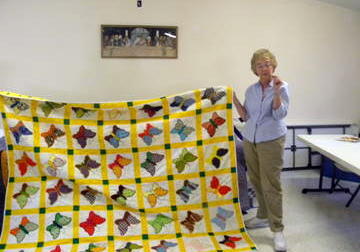 Carolyn Gragg an avid quilter, whose roots are deep in Calhoun County history, the daughter of the late Willard and Esta Jones of Five Forks, brought along her trunk full of quilts. From the trunk she pulled the very first quilt she'd made, a quilt for her daughter. Many quilts followed in this trunk show, but it was her final quilt that caught the eyes and hearts of those attending. Blocks of appliquéd butterflies, started by Esta, finished by Carolyn. The story started by one and finished by another.