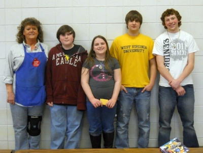 ![]() Arnoldsburg School - Back (L-R) Janet Davidson (cook), Bryson Montgomery, Barb Tingler (Café Manager) Center (L-R) Victoria Craddock, Gabriel Sanchez, Parks Metheney; Front, Jocey Cutshall