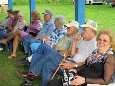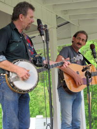![]() "Flashback" entertains crowd (L) while performers tune-up Bluegrass and mountain music will ring across the West Fork Valley hills tonight through Saturday during the Upper West Fork Park's annual Bluegrass Festival at Chloe. Bluegrass enthusiasts, many of them coming with their campers, will arrive for the three-day festival. Admission fee is still only $5 - ages 6 and under are admitted free.