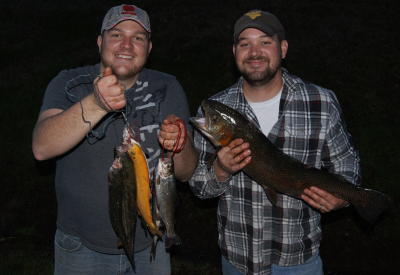 Ben Wood of Grantsville (right) caught this 27 inch, eight pound trout Sunday at Miletree Lake in Spencer, with Josh White of Arnoldsburg making a pretty good catch too