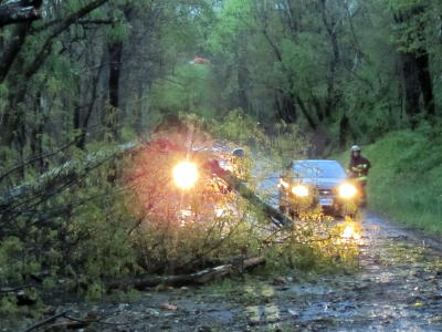 Grantsville Volunteer firemen responded to this tree Dozens of trees came down in county highways Saturday evening after a thunderstorm with high wind crossed the county. The effects of the storm appeared mostly in southern Calhoun. A tree downed electric lines on Sand Ridge, the Arnoldsburg VFD responded to the scene. US 33-119 was closed and power service to the Sand Ridge-Crummies Creek area was disrupted. The highway was reopened about 11:30 p.m. Saturday night. Electric service disruption was reported in the Beech area. Community members cleared numerous trees on secondary highways. The county's three fire departments responded to numerous calls related to trees and lines down on Nicut, Walker, Sand Ridge, Barnes Run and other areas. Roane county responders answered numerous trouble calls in southern Roane Saturday night. |
