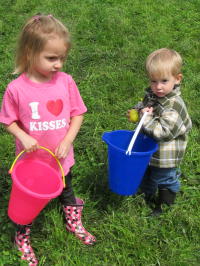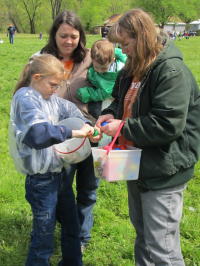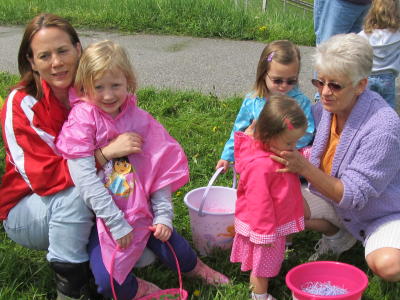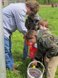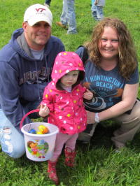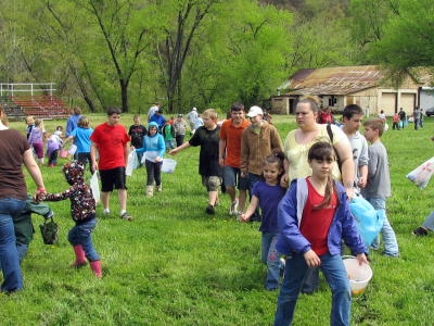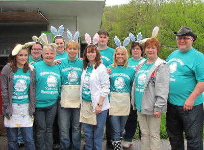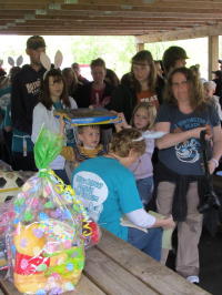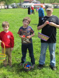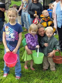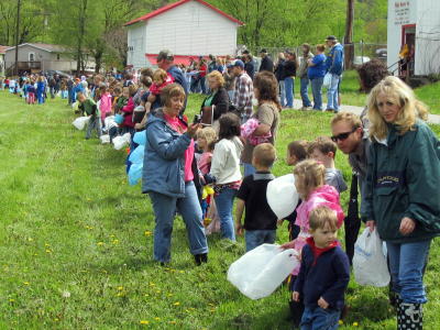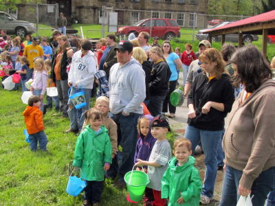 Sue and John Oshoway (front right) and their dutiful A rainy Easter weekend gave pause to the 17th Annual Melissa Oshoway Memorial Easter Egg Hunt, with another record crowd of area children and youth gathering eggs with anticipation of winning one of a dozen bikes and lots of other prizes. "We would like to thank all the volunteers that helped us hide eggs, give out prizes and worked in the concession stand," said John and Sue Oshoway. "We would like to also thank Richard and Anita Parsons, Emily Gainer, Melanie Erlewine Henderson (in memory of her dad, Richard Erlewine), Nancy Sams, and Sharon Gherke for their donations to help with the event. Also, Pettyville Walmart for their $100 (not $1,000 as earlier reported) donation and $10.00 off each bicycle, and Karen Boatright. Thanks also to the gentleman that gave us a donation at the Easter Egg Hunt." If you would like to make a donation to this annual event, contact John or Sue Oshoway at 304-354-9204 or 304-655-9931 or send to P.O. Box 156 Grantsville, WV 26147.