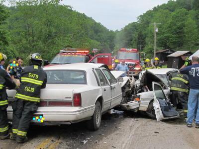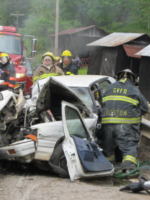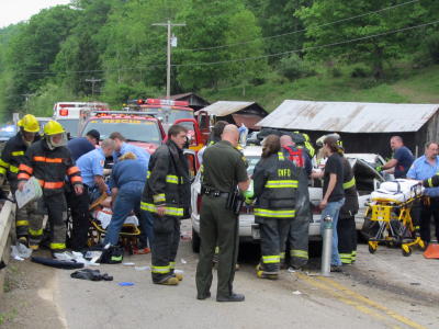 ![]() Rt. 5 crash causes intensive response, driver critically injured By Bob Weaver UPDATE 5/18 - State Police are saying charges are pending in a two-car crash that happened Saturday near Grantsville sending four victims to a Charleston hospital by chopper. Clyde "Pete" Paul Westfall, 32, is still in critical condition Tuesday at Charleston Area Medical Center, according to a hospital spokesperson. Trooper J. E. Kincaid said investigation of the accident is continuing. Trooper Kincaid released the names of the driver and occupants of the second vehicle involved in the crash. In the crash, Lester Selmon, 31, and his wife Denise Selmon, 27, and their two male children, ages 5 and 7. Mrs. Selmon was not hospitalized, but the other three Selmon family members were life-flighted to CAMC, where sources describe their conditions as stable. ORIGINAL STORY - A Calhoun man, about 32, was critically injured when he crashed Saturday morning with a vehicle on State Rt. 5, about three miles east of Grantsville. He was extracted from his vehicle by members of the Grantsville Volunteer Fire Department using saws and Jaws-of-Life. It was a tangled mess of metal as the vehicles came to rest on a bridge.