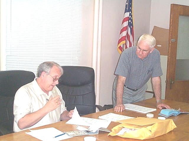 ![]() Commissioner Larry McCallister (L) and David Barr (R) canvass ballots The Calhoun Commission met yesterday morning for about three hours to canvass votes from Tuesday's primary election. Twenty-six challenged ballots made little difference in voter outcome. One precinct was hand-counted to validate the optical scanner, which is used to tabulate the ballots.