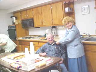 ![]() Donald (Duck) Stevens receives 12 gallon pin from Karen Law, volunteer