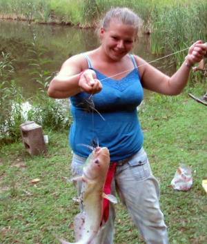 2011 - Maria McLaughlin is pictured above with an albino catfish she caught this week in a local farm pond. The fish was released back to the water