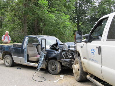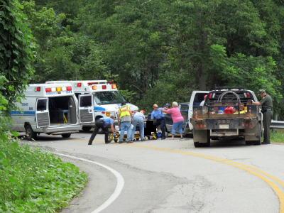 A two-truck collision just north of Orma sent two to the hospital just before noon today. A Dodge Dakota truck traveling northbound on Route 16 went left of center in a sharp curve and struck a service truck belonging to Eastern Oil Field Service, whose driver was not injured. One of the occupants in the smaller truck was taken by chopper to Charleston Area Medical Center, reportedly with a fracture. Another occupant was taken to Minnie Hamilton Health System for undisclosed injuries, with another male occupant suffering minor injuries not requiring treatment. Cpl. J. A. Bowles of the Grantsville Detachment investigated the accident. The Upper West Fork and Arnoldsburg VFD's responded when the report indicated possible entrapment.
