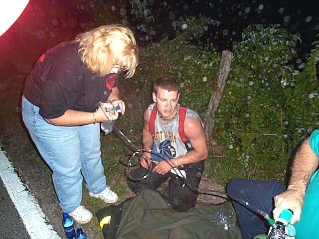 Emergency workers use pulley system to pull victims to highway The vehicle came to rest about 150 feet over a rocky and brush covered hill near the Little Kanawha River, about 4 a.m. The man was driving from the Munday Road area, and failed to turn left or right on fog-covered Route 5. Firemen lowered rescue baskets over the wooded hill to bring the victims to the highway. Calhoun EMS dispatched two ambulances to the scene, and the Grantsville VFD had two units respond.