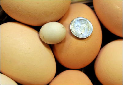 Former Agriculture Commissioner Gus Douglass dusplayed the world's smallest chicken egg, the size of a dime, in Charleston, brought in by Rev. Donnie and Karen Russell of Raleigh County in 2011, now certified by World Records Academy
