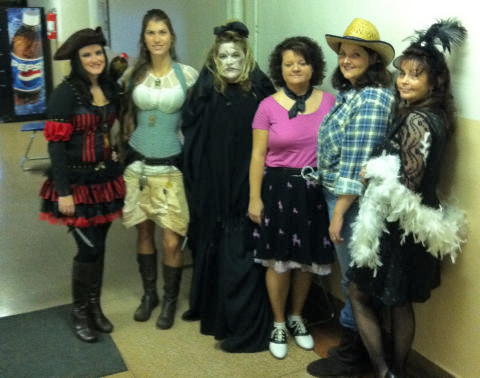 (L-R)April Wilson pirate; Megan Nealy steam punk; Lori Fleagle Frankenstein's Bride; Michelle Jones 50's sock hop; Denise Davis cowgirl, and Darla Taylor flapper girl