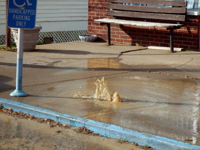 Grantsville had some water problems yesterday. A water line burst through the sidewalk and street, reportedly linked to a large semi-truck passing through, leak shown in front of former Koffee Kup restaurant (photo courtesy of Thomas Pumphrey)