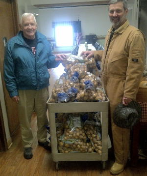 ![]() Bob Barker (left) and Charlie White of the Little Kanawha United Methodist Men donate and deliver potatoes to organizations in eight counties. The men are shown above delivering 800 pounds of potatoes to CCCOA, Grantsville Senior Center for use in the kitchen and for distribution to seniors. |