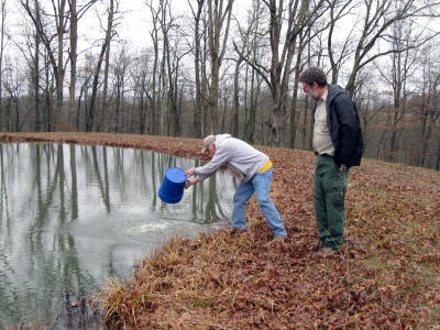 Butch Burch (left) and Scott Morrison After thirty years the first stocking of two ponds at Calhoun County Park were stocked with bluegill this month. The ponds will be stocked with large mouth bass later in the Spring. Because of the small size of fish, a catch and release policy will be in effect until the ponds become more populated. The Calhoun County Park board thanks Scott Morrison, DNR, Fish Biologist of Parkersburg and Charles Stephens, DNR, Of Calhoun County, along with Poe Gunn for help in clearing growth around the ponds. |