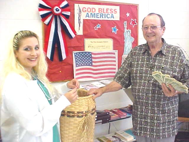 Anne-Marie Khoury (left) draws winning ticket, A hand-woven basket made by Garnet Barr was won yesterday by Donna Yoak of White Pine. The Calhoun Republican Executive Committee began raising funds for the Calhoun County Library during the Wood Festival, this time by selling raffle tickets. $250 was raised and donated to the local library, according to interim Republican Chairperson, Dan McDonald. |