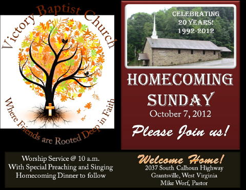 ![]() Victory Baptist Church will be celebrating their 20th year on Sunday, October 7, 2012. Pastor Mike Worf invites the community to join in the celebration beginning at 10 a.m with Worship and Preaching. Randy Skeens of Logan County, West Virginia will be bringing the message and Tommy Nutter of Ravenswood, West Virginia will be providing the special music. Everyone is encouraged to enjoy dinner on the grounds provided by the church and church families immediately following service.