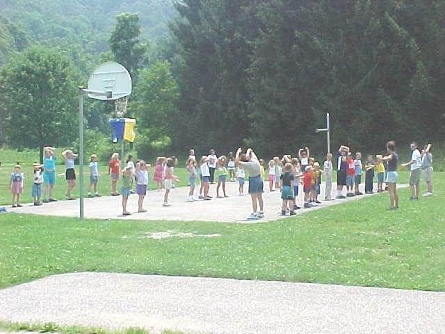 Dan Cosgrove Arnoldsburg Summer Academy has a different theme each week. This week's theme was "Health and Recreation". On Monday everyone, staff and students, lined up outside for an exercise period. Stretching exercises with a few jumping jacks got the heart pumping. On Tuesday, Bob Hamburg from Spring Creek Dairy in Spencer talked to the students about nutrition and gave samples of Tofu to the students. Tuesday was also "No TV Day". Students pledged not to watch TV or play a computer game for 24 hours. We will continue to exercise and try other healthy foods throughout the week. We'll wrap up the week on Friday, swimming at Cedar Creek State Park.