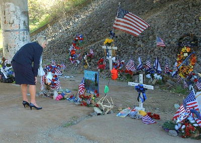 Joanne Tomblin, wife of Gov. Earl Ray Tomblin, visits the makeshift memorial for deceased state troopers under Wallback I-79 bridge (Clay Communicator Photo)