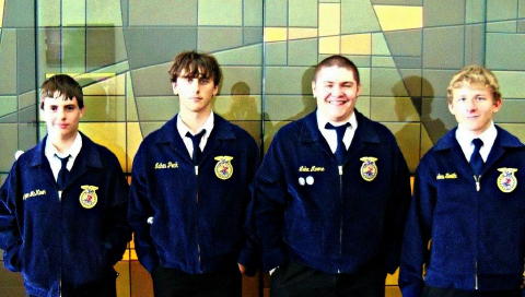 |  (L-R) Logan McKown, Nathan Peck, Luke Moore, and Nicholas Smith Four FFA students from Calhoun County attended the National FFA Convention in to Indianapolis, Indiana October 24-26. While there they attended an FFA opening session, hearing words of wisdom by Mr. Brown, who is the national FFA Advisor and listened to guest speaker, Scott Hamilton who was the 1984 Olympic Gold Medalist for the US figure skating team.