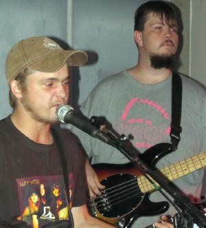 ![]() Lead singer Nicholson (left) sings a tune, with bass player Riffle (Bookings for parties and special venues 304-354-7084) |