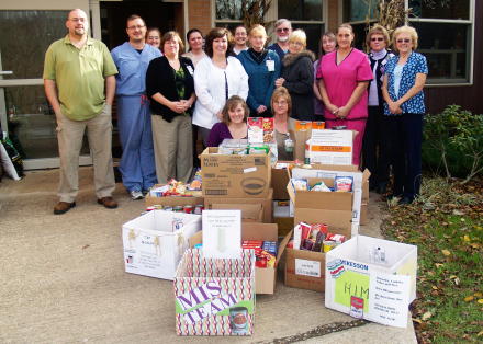 (Kneeling L-R) Lori Wells, Shelia Gherke; (Row 2 L-R) Craig Minnie Hamilton Health System employees from Health Information Management (Medical Records), Radiology and Management Information System Department weeks were observed the week of November 12th through the 16th. Each department had a day for games with prizes and with open houses with refreshments for Minnie Hamilton employees. Another part of the observation was an effort to collect food for the local food pantries. All employees were divided into three groups, either HIM, MIS or Radiology to see which team could collect the most items for our local food pantries. There was a total of 1545 items collected and distributed to the Grantsville First Baptist Church and CRI in Glenville.