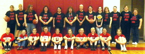 Back (L-R) Sharon Bennett, Suzanne Bennett, Betty realfang@citlink.net In the period leading up to Saturday night's game between the Girls (Young Chicks) and Moms (Old, er, Not So Young Chicks) the word was that the Moms team was going to bring a "whippin' stick" to use on the kids. The Moms talked about their all-state and all-conference players and how good they were and a lot of people believed them. But what the Moms failed to mention was that these ace hoopsters were really good - LAST CENTURY! How long ago was that? Well, none of the players on the Girls team were even born yet, that's how long ago. Since the days of hardwood glory the Moms have spent most of their time sitting on the coach eating bonbons while watching Oprah and Jerry. You, know, when they weren't having and raising kids and working at their jobs. A real life of leisure with no real thought of blocking out and crossover dribbles. It wasn't a basketball oriented thing ⦠except maybe for Ashley Hersman who doubles as the coach of the Calhoun Middle School girls team. And that's, like, one out of many who kept up with basketball. And during the game that rust and those bonbons showed as only Hersman and Suzanne Bennett, who was an outstanding player at Roane or Spencer (boo) during her high school days. Hersman had 10. As for the rest of the Moms' shooting, the bulls would have been safe if the moms all had bass fiddles. Brandi Richards had three points. Three ⦠as the next leading scorer. After that Jeannie Wade, Heidi Allen and Sam Fulks had two each and Betty "Jump Betty" Jones had one which was one less than her husband Jerry "Jump Jerry" Jones Sr. had in the boys game. For the girls Makayla Smith led the way with a game high 12 points. She was backed by Ashley "Cheeks" Hersman with eight, Tori Allen with six, Alisha Fulks with five and Callie Cooper and Kaylea Bennett with two each. None of the other girls scored as they believed the moms when the talked turned to "losing" their allowance or cellphone or, well, many other important things. The final score? Oh, yeah, the Girls won 35-31 after the Moms ran out of bonbon energy in the fourth quarter. The challenge is open for next year ⦠and the Moms have a year to put away the bonbons and pick up the basketball. Girls who scored - Makayla Smith 12 points, Ashley Hersman 8 points, Tori Allen 6 points, Alisha Fulks 5 points, Callie Cooper 2 points, Kaylea Bennett 2 points. Mommas - Angie Hersman 11 points, Suzanne Bennett 10 points, Jeannie Wade 2 points, Heidi Allen 2 points, Betty Jones 1 point, Brandi Richards 3 points, Sam Fulks 2 points.