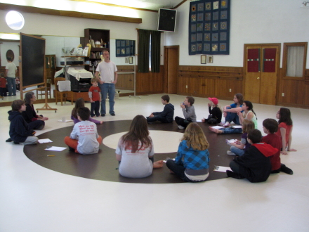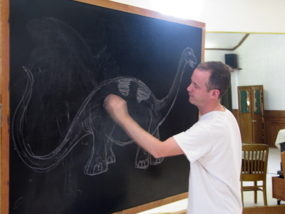 Gideon Kendall address the class in Barbara's Room with his Students of Heartwood in the Hills Artwork for Kids class enjoyed a presentation by artist Gideon Kendall on Wednesday, March 27, 2013. The class also included an exhibit of the original illustrations for the book "Dino Pets". Gideon attended Calhoun County schools in the 1970's-80's. He graduated from The Cooper Union School for Science and Art in New York with a BFA in 1989. For the past 15 years he has been working as an artist, illustrator, animation designer, and musician in Brooklyn, New York. In 2001 Gideon published his first children's book; "Little Bats Halloween Story" written by Diane Mayr and published by Albert Whitman & Co. His other books for children include "Dino Pets" by Lynn Plourde (Dutton, summer 2007). He is currently working as an illustrator for "Highlights" magazine. Gideon and his wife, artist Julie Peppito, have been guest artists at Heartwood over the years and have also performed in a number of Heartwood productions. The Kendalls reside in Brooklyn, NY with their son, Milo. Gideon is the son of Heartwood Artistic Director Jude Binder and Heartwood co-founder Frank Venezia.