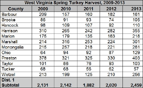SOUTH CHARLESTON, W.Va. - Preliminary harvest figures for the 2013 spring gobbler season indicate West Virginia hunters checked in 10,974 bearded turkeys, according to Curtis I. Taylor, chief of the Division of Natural Resources Wildlife Resources Section. This year's harvest represents a 32 percent increase over the 2012 harvest and is 13 percent above the previous five-year average. "Our biologists expected a higher harvest because of the carry-over of birds from last year's lower harvest," said Taylor. "In addition, the weather was perfect for hunting, especially during opening week when the majority of hunters were in the woods." The 2013 harvest was higher in all districts and 52 counties compared to 2012. While the harvest in District 2 virtually equaled the five-year average, the other districts saw significant increases above that average. Harvest in District 3 increased almost 21 percent over its five-year average and both Districts 1 and 4 saw increases of 15 percent as well. The top 10 counties were Preston with a kill of 403, Mason (360), Harrison (355), Kanawha (327), Ritchie (325), Jackson (312), Greenbrier (309), Wood (308), McDowell (305) and Marshall (301). The 2013 harvest was the highest since 2006 and stopped a declining spring harvest trend that began in 2007. Similar to most hunted species, reproduction is correlated to harvests. Average fall mast crops which keep hens in good physical condition through the winter, followed by average springs with moderate rainfall, ensure good poult survival, which increases the population for future harvests. "Because a significant portion of the harvest is composed of two-year-old birds, one factor that added to this year's harvest was the successful poult production in 2011," Taylor said. "We are hopeful that this spring will continue to provide moderate-to-average rainfall and we will have above-average reproduction, rebuilding the turkey population to levels we experienced a decade ago."