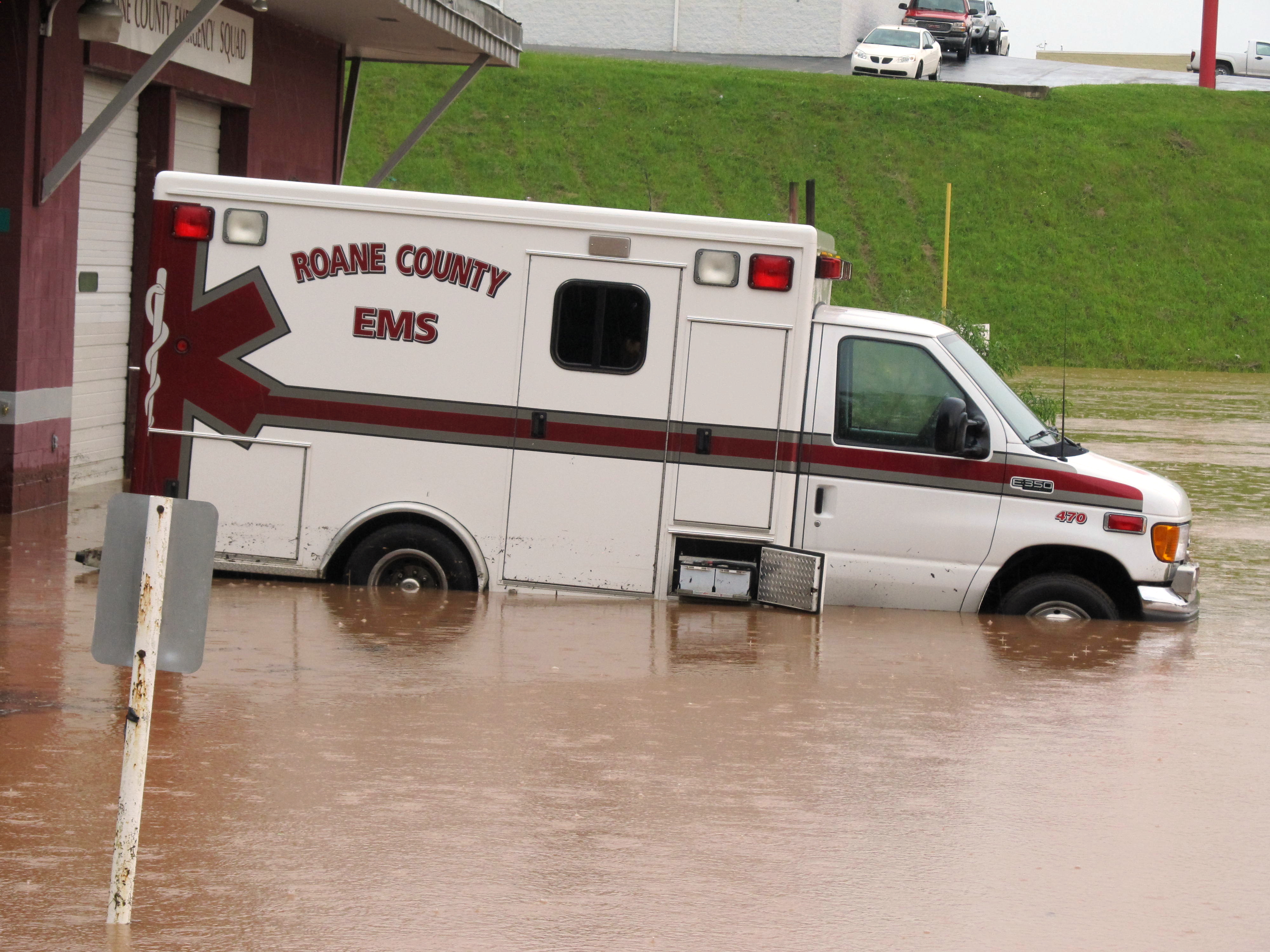 Ambulance squad rescues three ambulances, Roane's 911 Center was evacuated Thursday as rapidly rising water surrounded the building, with 911 calls being diverted to Jackson County, and WV Homeland Security sending mobile assets to the county which has been declared a State of Emergency. The adjacent Roane County Emergency Ambulance Squad managed to get three ambulances out of their garage during rapidly rising water, but had to leave a fourth ambulance.