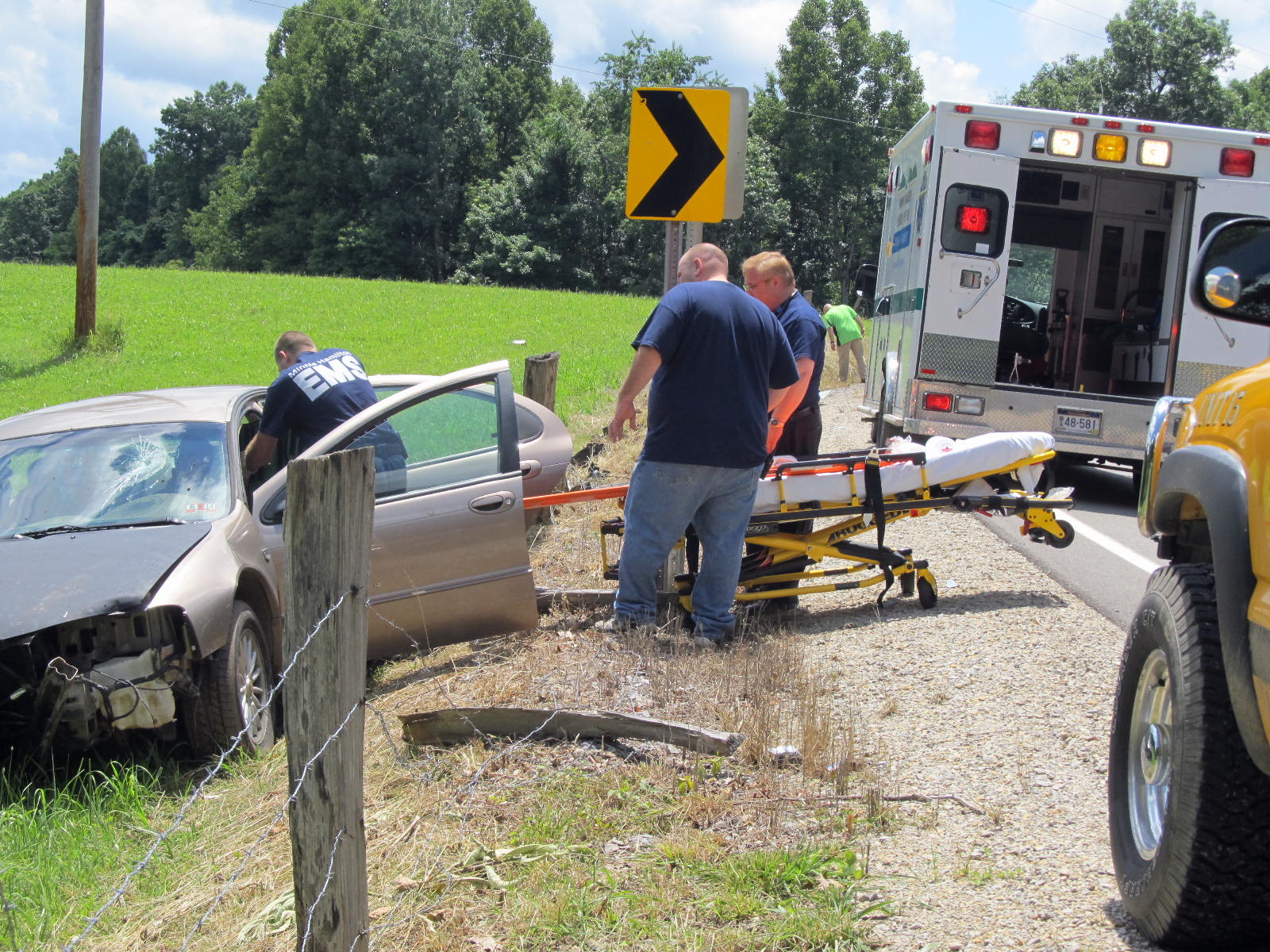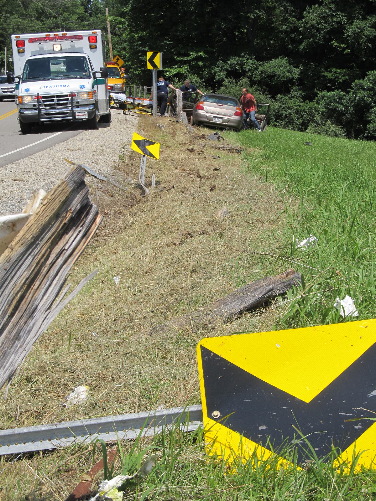 ![]() A 55-year-old female driver lost control of her vehicle on the curvaceous Mt. Zion Ridge (Rt. 16) Monday afternoon, clipping off a dozen fence posts and four directional signs. The woman was complaining of back pain when the Grantsville VFD and Minnie Hamilton EMS removed her from the vehicle. She was taken to MHHS for treatment.