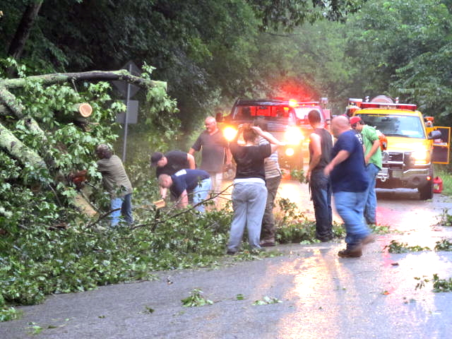 ![]() Grantsville VFD members exercising their volunteerism on Barnes Run Monday evening clearing a fallen tree blocking the highway, one of many situations that volunteers serve the community, the UWVFD also responding to tree blocking road on Nicut |