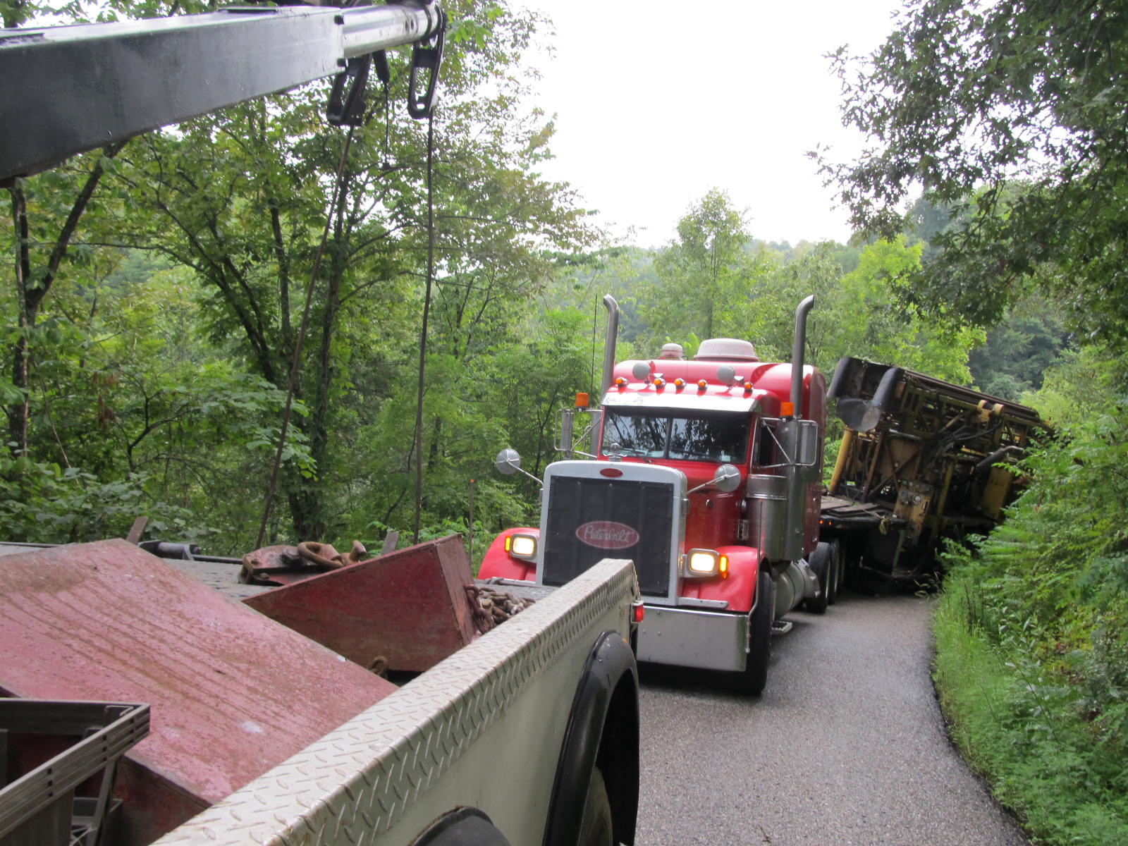 ![]() This long drilling rig headed for Tennessee got hung up twice in the twists of Sycamore Road Thursday for several hours, a problem mobile homes and long trailers face on Calhoun's twisty roads, Furr's and Peiffer's wreckers worked for several hours getting it dislodged, the Arnoldsburg VFD responded to the scene for traffic control