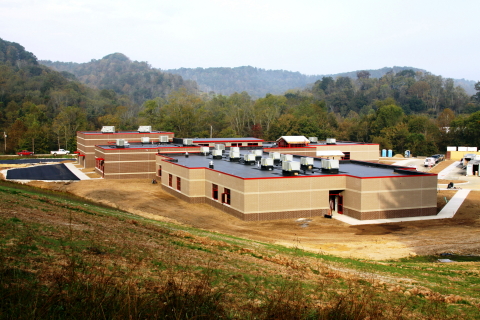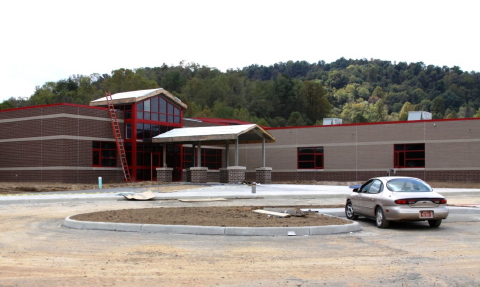 ![]() View from the hill behind the building showing newly paved play areas Progress is on schedule at the new Arnoldsburg Elementary School, with concrete floors being polished, kitchen equipment being installed, tile in bathrooms and kitchen completed, all utilities are on, and wiring is being completed for computer networks and telephone systems.