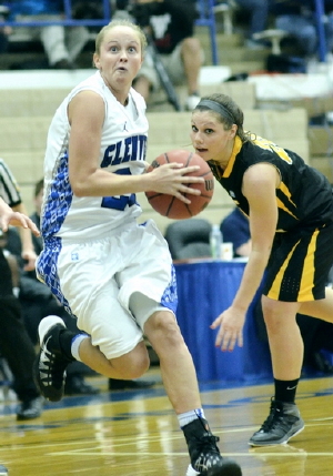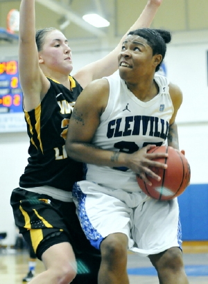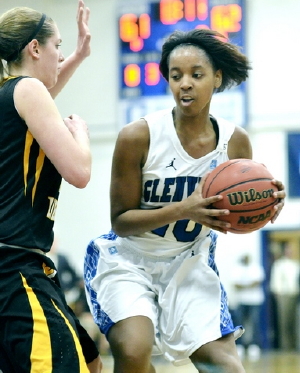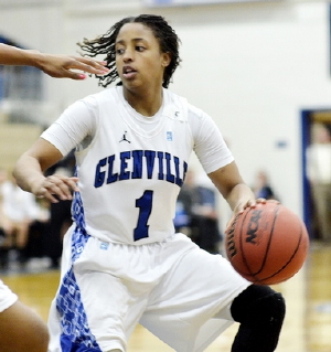 Tiffani Huffman makes a move driving past two defenders and scoring Glenville advances to the semifinal round of the NCAA Atlantic Regional Tournament tonight at 7:30 p.m. Tasia Bistow and Kenyona Simmons both scored 21 points while Briauna Nix chipped in 12. Glenville shined at the foul line hitting 29 of 33 attempts. Aesha Peters held her own underneath with 5 blocked shots and 10 rebounds. Simmons had 10 boards, closely followed by Briauna Nix's eight. West Liberty's Liz Flowers led her teams scoring with 26.