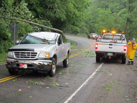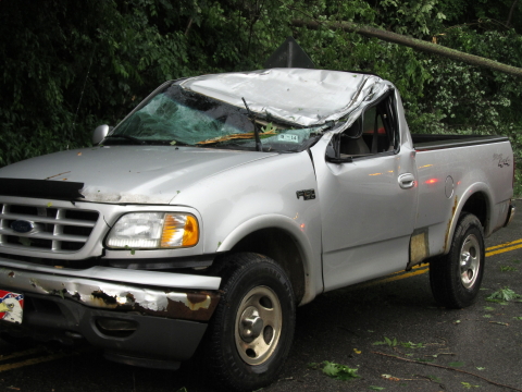 THREE INJURED WHEN TREE CRASHES ON TRUCK DURING STORM |