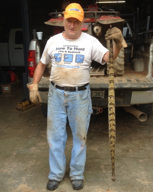 Robert Buck Kirby was pumping wells on Leading Creek in Calhoun Country when he killed this big 50 inch timber rattlesnake