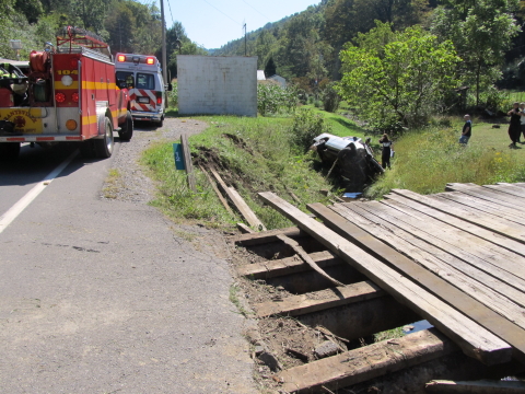 The driver of a pick-up truck heading south on St. Rt. 16 just out of Grantsville, lost control of his vehicle, riding the berm for a considerable distance, striking the end of a bridge, which was damaged, and then crashing into Phillips Run. The accident happened about 1:30 p.m. Wednesday. The driver was taken to Minnie Hamilton Health Systems by MHHS-EMS for treatment of what appeared to be minor injuries. The Grantsville VFD also responded to the accident. |