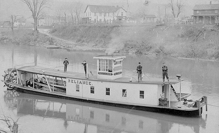 In 1907 Parkersburg had two floods, one of over 40 feet on January 21st and the other cresting at nearly 52 feet on March 16th. According to old records, March 16, 1907 was a bright sunny day. Despite the welcomed sunshine, Parkersburg was an island with all roads in and out of the city cut off by the high water. But there were the boats which ran regularly on the Ohio and Little Kanawha Rivers, flood or no flood. And, there were trains, or at least there had been. On the morning of the 16th, the Baltimore and Ohio's crack train, The St. Louis Limited, was trying desperately to reach Parkersburg with its 105 passengers and her crew. It seemed The Limited would make it but, about half a mile west of Kanawha Station, high water on the tracks put the fire out under her boiler. With the fire gone, the supply of steam declined rapidly and the train came to a hopeless halt surrounded by the muddy waters of the Little Kanawha River. However, there was just enough steam left for the engineer to blow a distress signal to a boat which could be seen passing rapidly, riding the swift current downstream toward Parkersburg. An old newspaper reports "Captain Bill Stump, skipper of the gasoline sternwheeler, RELIANCE, was headed downstream from Grantsville with a barge 16 feet wide and 60 feet long. The barge was loaded with white oak staves consigned to the Standard Oil Co. Refinery which was then located on Staunton Ave. These staves would be delivered and a load of oil field equipment would then be taken back up the river and delivered to different locations between Burning Springs and Grantsville."