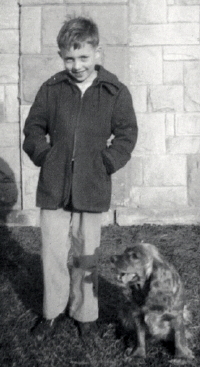 It was at this point that we would turn around and start for home. Many times during those afternoon walks, Minnie would hunt for and find a box turtle. She would pick up the hissing and tightly clamped thing and carry it in her mouth. Naturally she would drop the turtle and chase after it as it rolled downhill. Everyone except the turtle thought this was a fun experience. Finally Mother would make Minnie give up the turtle and we would resume our journey home. With Minnie ranging far out in front of us, Mother would examine the turtle to see that it was none the worse for wear and place it behind a rock out of Minnie's sight. Unlike me, Mother always hoped that Minnie would not find another turtle that day. I remember when on one of our journeys, Minnie found a turtle with a small chip in its shell. When Mother took the turtle away from her, she noted that it also had a missing foot. Mother climbed high on the hillside above the road and hid that turtle behind a large tree hoping Minnie would never see it again. Next trip, Minnie found it again. This time in the middle of that dirt road. Mother said that the hard luck turtle certainly had a bad sense of timing because of everything that had happened to it. Upon arriving home from those afternoon trips, it was expected that Minnie and I would take naps. I remember that Mother would read to me a portion of the story of The Nutcracker. It might have been a chapter a day. That story concerned a princess's broken Christmas toy magically transformed into a charming young prince and his adventures with the mouse king. Typically, before the chapter was finished, I would be asleep with Minnie snoozing on the floor beside my bed. In 1948 Minnie moved with us to Hardman Alley in Grantsville. Circumstances were different now and she no longer had the freedom to move about as she had on Phillips Run. Dad erected a fence that ran between our house and the property that belonged to Dr. John Boling who had the Clinic uptown. This was basically a four foot wide runway extending only the length of our house to the back side of the Jack and Effie Bickerstaff residence. My parents soon realized that Minnie was not happy being confined to such a small space. Mother started letting Minnie out in the alley for short periods. Generally when she was allowed out, myself or a family member would be with her. She would romp and play and fetch thrown balls. Over time it became a common sight seeing Minnie range up and down the alley. It didn't matter whether it was a tennis ball, rubber ball or baseball, Minnie would always return with it and be ready to go again. My arm would tire out and I would make Minnie climb the porch steps with me so I could rest. I remember one time that I threw a football down the alley thinking I would trick her because there was no way she could handle it. When Minnie got to the ball, she pushed it with her nose finally locating the laces and latching onto them returned half carrying and half dragging it to me. I was shocked at the appearance of my football that now needed new laces. My trick had obviously backfired on me! Soon everyone on Hardman Alley recognized Minnie and knew that she was a friendly dog. Our neighbor, Virginia Arthur, who lived across the alley was especially fond of her and Minnie spent a lot of time lying on her porch. Eventually we became even more lax in our supervision and Minnie would be gone for extended periods. After an absence of an hour or so, my Mother would become concerned and send me out to look for Minnie. She never failed to respond to my calling for her, but at times she would be returning from Mill Street or River Street. It was evident that she was becoming a town dog and hopefully wise in the avoidance of automobiles. Bob Knotts had an auto repair shop {garage} just beyond Arnold Motor Sales on Court Street near the intersection to River Street. Mr. Knotts, his wife Hazel, and children, Jim and Norma, lived upstairs in the wooden building. One day Minnie wandered over to the shop. I'm sure it wasn't long before she was wagging her stubby tail as Mr. Knotts petted her and talked to her. It was several weeks later when Dad was out searching for Minnie that he saw her there. Mr. Knotts confided that Minnie had been visiting his place on a regular basis. He said that she would lie on the shop floor and watch him work and was good company and helped him pass the time of day. Dad also learned that the Knott's family had virtually given Minnie free reign as she regularly climbed the steps to their apartment and basically made herself at home to the family's delight. I remember an incident that happened in early 1949 when Minnie was three years old. She came up missing and neither the Knotts family or my family new what had happened to her. We knew that Minnie would be more than willing to climb into someone's car and go for a ride. We assumed that was the case, but we also knew that she wore a collar with a metal rabies vaccination tag indicating she was owned by someone. By the fifth day we had almost given up hope of her returning when she reappeared on our porch wagging her tail happy to see us. It was suggested that she had been taken by someone who subsequently learned that she belonged to the Underwood family and for that reason was returned. This is not to say that our family was in any way special, but Dad was well known throughout the county as a coach and teacher. We never did learn where she was during those missing days.