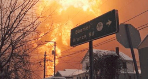 UPDATE - The crude oil from the wreckage of a train at Boomer, after a series of explosions, was still burning Tuesday morning. Hundreds of residents evacuated from the area remain in shelters. Much of the area does not have electric service, but some water company intakes have been reopened. The CSX train with 107 tank cars of Bakken Shale crude oil from North Dakota to a terminal in Yorktown, Virginia derailed, a regular route for oil delivery. A train carrying crude oil on the same North Dakota-Virginia route derailed in Lynchburg, Virginia in April 2014. A 74-car train carrying the same Bakken Shale crude oil derailed in Quebec, Canada in 2013, setting off fires and explosions that killed 47 people, the subject of national media attention regarding the safety of old rail cars following numerous train derailments. Officials said ice may have prevented further contamination of the Kanawha River. A number of agencies are investigating.
