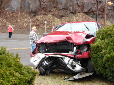 Occupants escaped injury in a truck-car collision with both vehicles heavily damaged, at the intersection of Rt. 5-16 in Grantsville Saturday afternoon. The Grantsville VFD and Minnie Hamilton EMS responded to the accident scene shortly after 1 p.m. Some rock slides into highways have been reported Saturday following heavy rain, including a slide partially blocking traffic on Liberty Hill. |