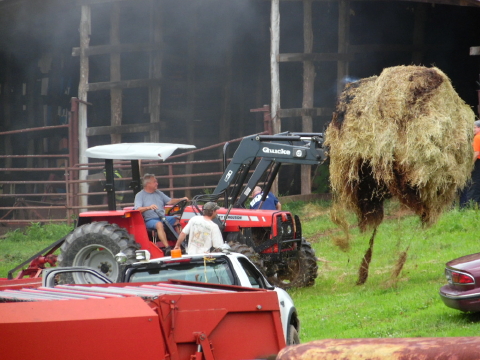 Large round bails of hay ignited inside a barn at Big Bend Tuesday morning, apparently by spontaneous combustion. The barn and hay, belonging to the Cain family, was just west of Brooksville Baptist Church along State Route 5. The Grantsville VFD responded at 10 a.m. with water poured on the hay and the large bails pulled from the barn. |