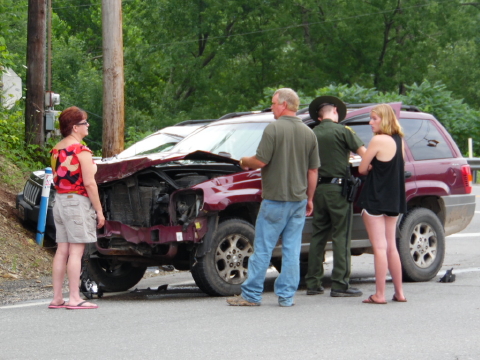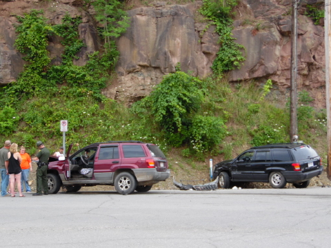 Two vehicles collided at Grantsville's main intersection Sunday at 11 a.m. (Rt. 16-5) at the end of the Bernard Pious Bell bridge, doing extensive damage to the vehicles and sending some of the occupants to Minnie Hamilton Health System for evaluation. Minnie Hamilton EMS, the Grantsville VFD and State Police responded to the incident. |