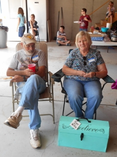 Don and Laura Pye (left) win Beekeepers' toolbox doorprize; Larry Siers (right) shows bee with malformed wings