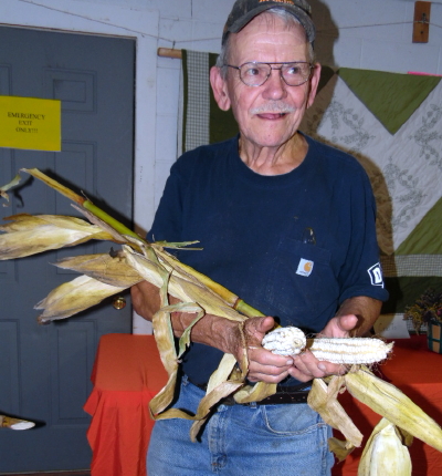 Charlie McKown of Millstone displays stalks of corn with four or more ears, McKown saying "It takes a little extra effort."