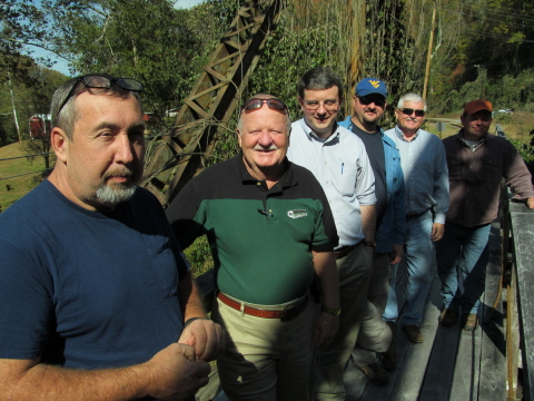 L-R: Mitch DeBoard, Delegate David Perry, Delegate Roger The Buffalo Creek Recreational Trail runs from Pisgah Bridge in Clay approximately 20 miles to the mining town of Widen. The areas along the trail are rich with mining history and natural scenery. On October 22nd, members of local government and West Virginia University toured sections of the trail discussing its accomplishments and future uses, including, Mitch DeBoard, Clay BDA, Delegate David Perry, Delegate Roger Hanshaw, Paul Kinder of WVU Davis College, Roger Lipscomb of Trak Spec Railroad and Michael Shamblin, WVU Extension Agent, and Ed Hamrick of WVDEP. "Good things have happened", explained Mitch DeBoard, President of the Clay Business Development Authority. "Three bridges are now decked and local donations are in place to deck two more. The stream quality is improving too. Most of Buffalo Creek now supports both bass and trout." To learn more about how to volunteer, please contact the Clay County Business Development Authority at 304-587-4166 or the WVU Clay County Extension Office at 304-587-4267.
