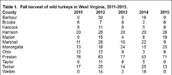 SOUTH CHARLESTON, W.Va. - Fall turkey hunters checked in 1,131 turkeys this fall from 33 open counties, according to Keith Krantz, wild turkey and upland game bird project leader for the West Virginia Division of Natural Resources (DNR). Leading the state, Randolph County hunters reported harvesting 114 birds, followed by Greenbrier (81), Preston (71), Nicholas (63) and Pocahontas (62) county hunters. Preston County hunters have a two-week season while the others in the top five counties had four-week seasons. The 14 "traditional" fall hunting counties accounted for 56 percent of the total fall harvest, which was very similar to previous years. All six DNR districts were open to fall turkey hunting in 2015. District 3 led the state with a harvest of 371 birds, followed by District 4 (208), District 2 (196), District 1 (185), District 6 (109) and District 5 (62). "Fall turkey harvests are driven by a number of factors, including hunter participation, recruitment of turkeys into the population, and availability of hard mast," Krantz said. "Harvest is relatively low in many of our nontraditional counties because hunters there were likely bowhunting for deer and not fall turkey hunting. Harvest numbers, therefore, may not reflect relative abundance of turkeys in those counties." DNR's annual Mast Survey Report found oak mast to be spotty at best. which likely concentrated birds at localized food sources in many traditional counties. The hunter outlook part of the Mast Survey accurately predicted a turkey harvest similar to the 956 taken in 2014.